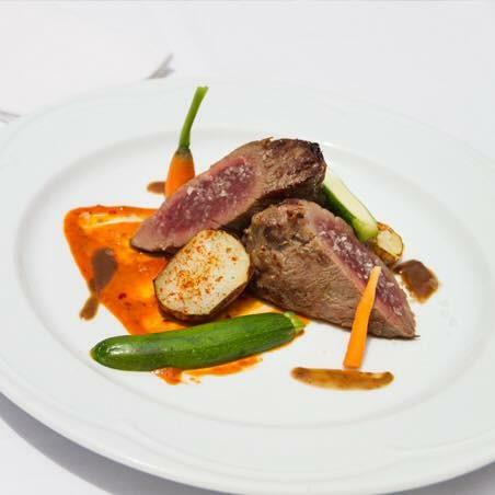 Presa ibérica con marinado japonés sobre mojo rojo y patatas al pimentón dulce