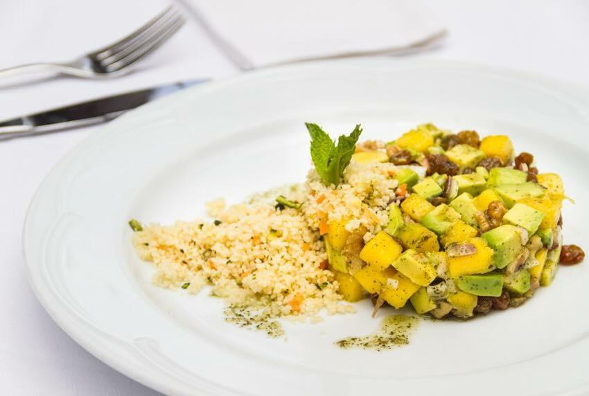 Ensalada templada de mango,aguacate,frutos secos y taboulé de menta